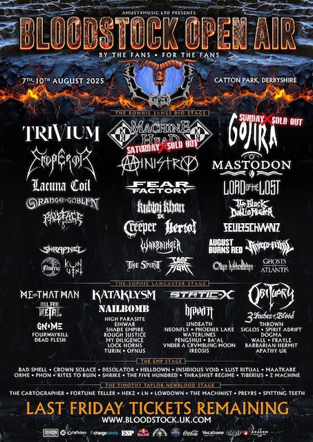 BLOODSTOCK’s 2025 Ronnie James Dio stage headliners are TRIVIUM, MACHINE HEAD, and GOJIRA. Headlining the Sophie Lancaster stage will be ME AND THAT MAN, KATAKLYSM, STATIC-X, and OBITUARY. You’ll also be able to see MASTODON, NAILBOMB, MINISTRY, EMPEROR, FEAR FACTORY, LACUNA COIL, HERIOT, ORANGE GOBLIN, CREEPER, KUBLAI KHAN TX, CAGE FIGHT, RIVERS OF NIHIL, FLOTSAM & JETSAM, THE BLACK DAHLIA MURDER, FEUERSCHWANZ, LORD OF THE LOST, PALEFACE SWISS, AUGUST BURNS RED, WARBRINGER, UNDEATH, SPIRIT ADRIFT, THROWN, ALL FOR METAL, BREED 77, HIGH PARASITE, and 3 INCHES OF BLOOD. Joining them are SHRAPNEL, FAMYNE, KONVENT, THE SPIRIT, GHOSTS OF ATLANTIS, ONE MACHINE, MY DILIGENCE, SHADE EMPIRE, EIHWAR, WATERLINES, PHOENIX LAKE, NEONFLY, WALL, DOGMA, SIGLOS, DEADFLESH, FOURWAYKILL, GNOME, TURIN, LOCK HORNS, OFNUS, ROUGH JUSTICE, IREOSIS, BA’AL, FRAYLE, PENGSHUI, VNDER A CRVMBLING MOON, APATHY UK, BARBARIAN HERMIT and more!