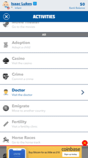 There is also an Activities button where you can perform certain actions like Go to the Doctor or Commit a Crime or Play the Lottery. All becoming active at different points in your life, depending on the route you take.