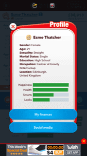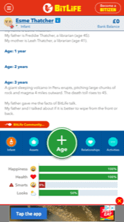 You start off each playthrough of Bitlife by pressing on a little sperm icon and creating new life. You get a randomly generated character and some information on them. What is their name, when is their birthday, whether you were planned or an accident, where you live and who is in your family. On the screen you get a few levels to keep an eye on.