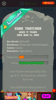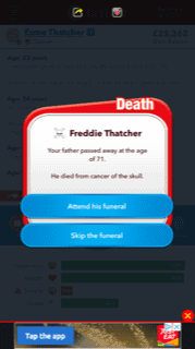 Bitlife is nice and clean with simple and easy to read visuals. The sound effects are good and work well with the adult humour in the game. The funeral march at your death, the baby cry at your birth. It is detailed and you can tell the developers have put effort into the game.