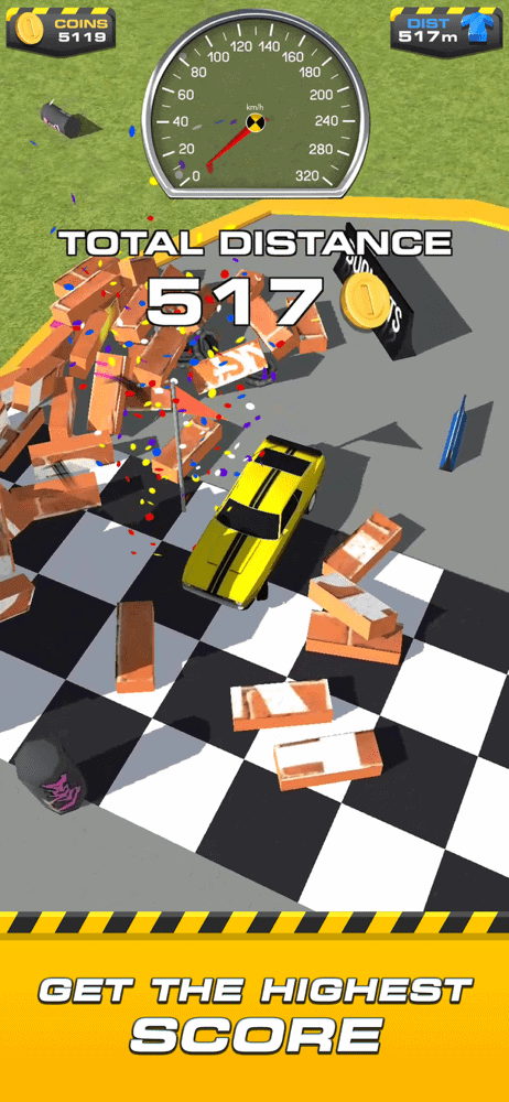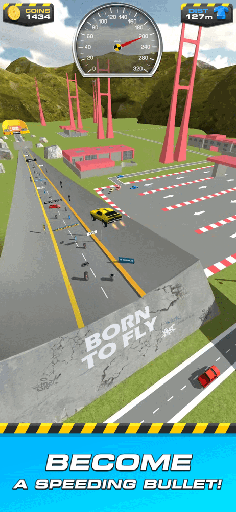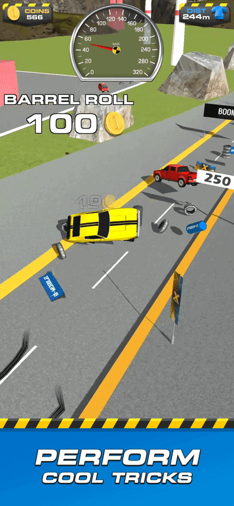 At first you won’t get far but you’ll quickly start earning coins from the damage you do as well as the tricks your car does during its spectacular crash. Coins that are then spent on upgrading either your engine, boost and coin bonus. The two that really matter for distance is the engine and boosts upgrades. Self explanatory really but the former speeds you up as you make your ramp descent while the latter improves your car launch once it hits the jump.