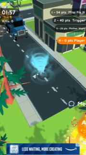 The other tornadoes are the important bit though in regards to winning. The scenery is just for growth. You do pick up points from destroying the scenery but much more for kills. Kills are the eating of another tornado. Get enough points to finish the round top of the pile and you win. Still, after many, many attempts I have yet to even be nearly challenged for 1st position so it isn’t that tough to win.