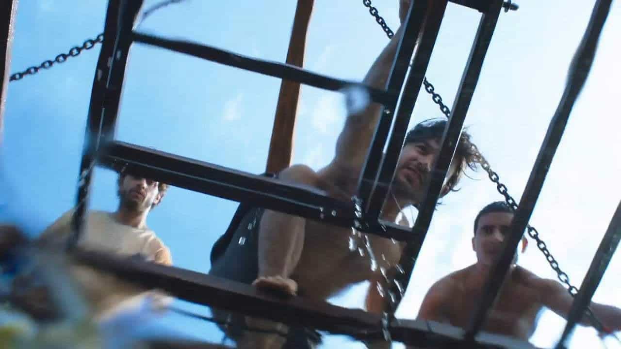 When they arrive at the boat dock, Lisa is immediately wary of the boat and its owner, Captain Taylor. He asks if the sisters are experienced divers; Kate is certified but Lisa is new to diving, but they lie and say they are both experienced. The dive cage is old and rusty, and hangs from thin chains on an old crane, adding further to Lisa’s apprehensions. When they reach the diving spot, Captain Taylor baits the sharks and the locals dive first. Unbeknownst to everyone on the boat, the cable supporting the cage starts to fray.