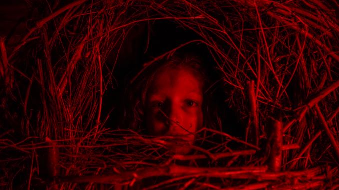 A siren blasts and red spotlights illuminate the cabin, where they notice Mark being dragged by three masked figures to pin him to the living room table. They see Mark have his eyes impaled by sharp skewers and his feet broken by a wooden hammer. The trio drag Mark’s body outside while the rest of the group waits for dawn to escape through the forest. After finding a graveyard of abandoned cars, they realize they are not the first victims of the cult’s fanatics.