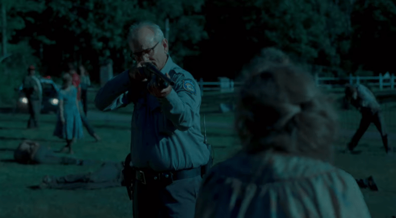 Centerville police officers Cliff Robertson (Murray) and Ronnie Peterson (Driver) briefly confront local eccentric Hermit Bob in the woods. Afterwards, Cliff remarks that it is still daylight after 8pm while Ronnie notices his watch and cell phone have stopped working. A song called “The Dead Don’t Die” plays on the radio, which Ronnie tells Cliff is the theme song.