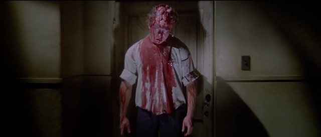 The movie opens with a young woman redressing after a late-night tryst with her boyfriend in an abandoned house. Looking for her boyfriend, she finds his body, having been murdered with scissors before she is violently stabbed through the skull. The opening ends with her bloody body being dragged through the cellar door. It’s a couple of minutes long and certainly shocks. The knife in the skull is deliciously harsh.
