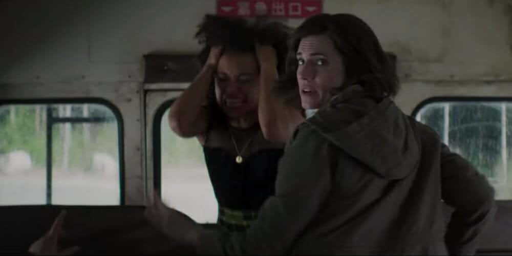 When Lizzie awakens with a hangover, Charlotte offers her some ibuprofen, which she takes with a shot of alcohol, and joins her on a trip through rural China. Boarding a bus after eating at a street food stall, Lizzie begins to feel progressively ill and takes more of Charlotte’s ibuprofen. As her condition worsens, she throws up maggots and spirals into a panic. Frightening the other passengers until the driver ejects her and Charlotte from the bus, stranding them in the countryside. Increasingly ill and paranoid, Lizzie sees bugs crawling inside her arm and eventually bursting out of her skin before Charlotte offers her a meat cleaver, and Lizzie hacks off her infected right hand.