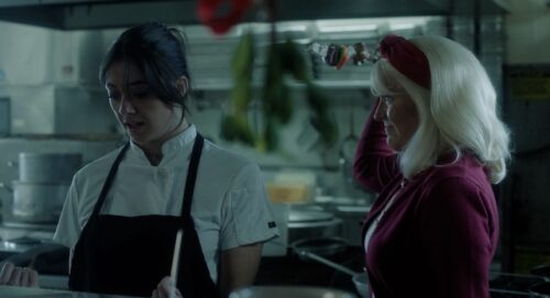 Especially when a Karen comes to dine. This Karen is played by Leanna Adams, who delivers a film stealing performance that is hilarious, campy, and threatening. All she wants is things to be perfect, so when it’s not, the staff suffer the consequences. Some of which are eye-watering, and almost always silly and fun.