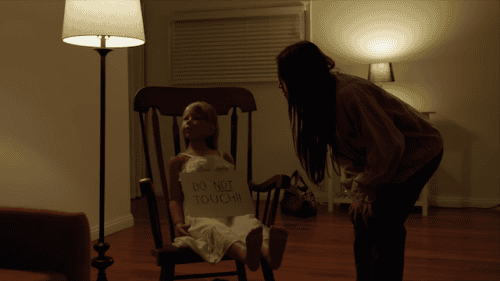 The former plays Abigail, a young woman on a house-sitting job who is frightened by a realistic looking doll that is sitting in a chair when she arrives. A doll with a sign saying, ‘do not touch’. It’s creepy, but harmless, until she inevitably touches it.