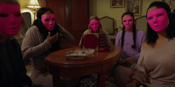Arriving at Lauren’s house, Grace sees that the two masked women have followed her and she bangs on the door to get her friend’s attention. When Lauren answers, the two women are gone and Grace is brought inside where more friends are waiting.