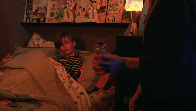Ms Robin (White) is searching the cupboard for some honey, when a noise alerts her to a near-empty bottle on the floor. Conveniently near a Winnie the Pooh teddy. She goes to her son’s room, Christoper, and accuses him of having gotten into the honey, but he denies that.