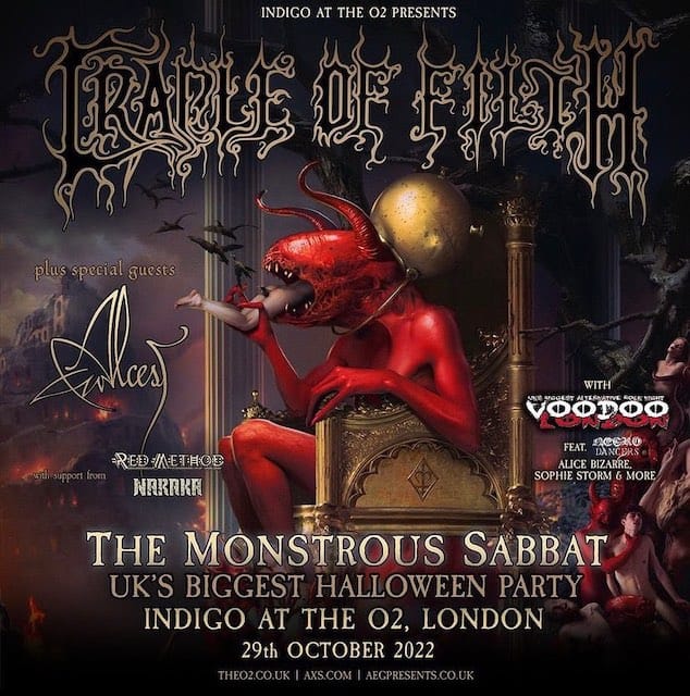 This Halloween, something dark and devious crawled from the depths of Hell to entrance London. It’s the Monstrous Sabbat and for one night only, The Indigo at the O2 hosted the wickedness of Cradle of Filth. Alongside the atmospheric misery of Alcest, the powerful and punchy groove of Red Method and the intense heaviness of Naraka.