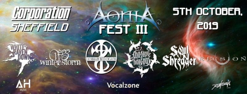 Doors will be at 2:30pm. Organisers Aonia are celebrating the anniversary of their debut album ‘The Seven’ – and so, the festival features SEVEN outstanding bands from across England and abroad: Aonia, Chasing Dragons, Lesbian Bed Death, Elusion (BE), White Raven Down, Winter Storm, and Soul Shredder.