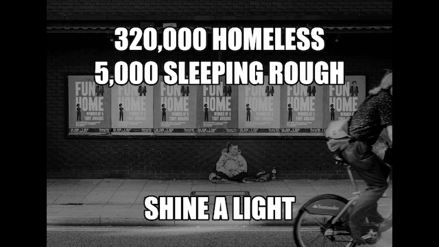 Having been to California and seen the iconic HOLLYWOOD billboards re-written HOMELESS to highlight the plight of the homeless people in America, and seeing every shop doorway in Covent garden in England being used to house the homeless, they decided to look the statistics for England and the results were shocking.